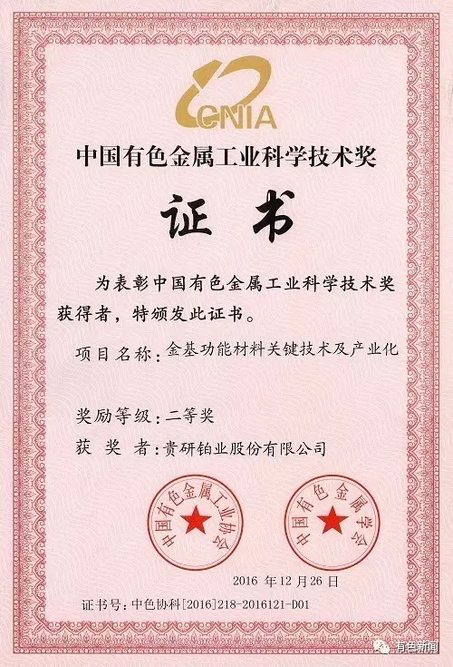 本刊讯】云南省贵金属金年会招牌至上有限公司两项国家科技支撑计划项目——“重要药物合成用铂族金属催化剂产业化制备技术的开发与应用”以及“金基功能材料关键技术及产业化”分别获得2016年度中国有色金属工业科学技术一等奖、二等奖。本文对这两个项目的研发背景、应用价值作了介绍。