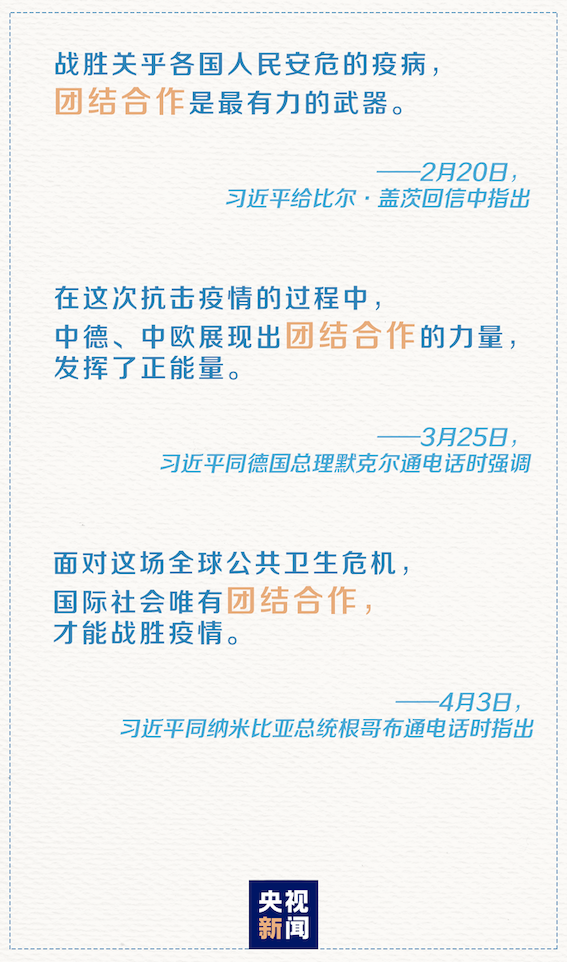 习近平在与各国领导人交流时给出了战胜疫情的“中国倡议”——让合作的阳光驱散疫情的阴霾。
