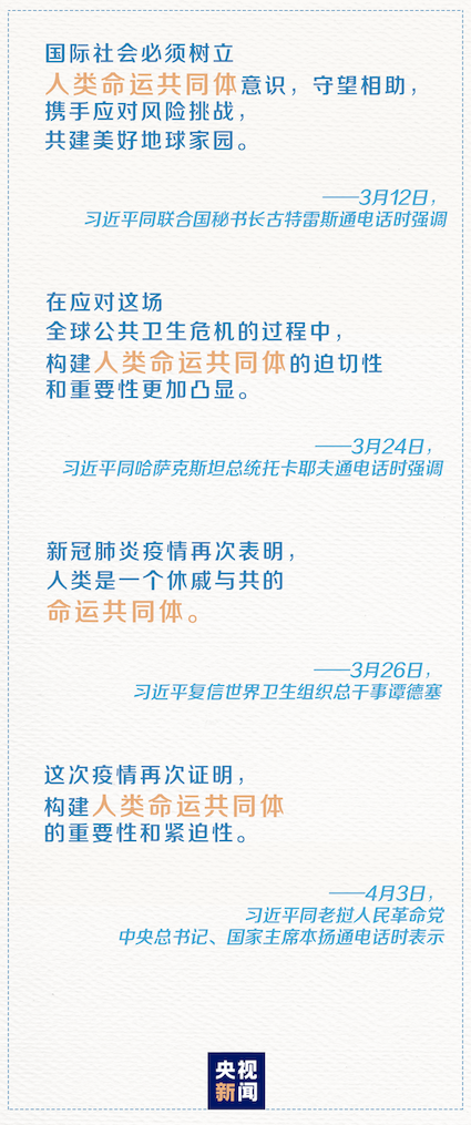“疫情没有国界,世界各国是休戚与共的命运共同体。”2013年3月,习近平在莫斯科国际关系学院面向世界提出“命运共同体”理念。战“疫”时期,习主席关于构建人类命运共同体的阐释和呼吁,在世界范围引发强烈认同和广泛共鸣。