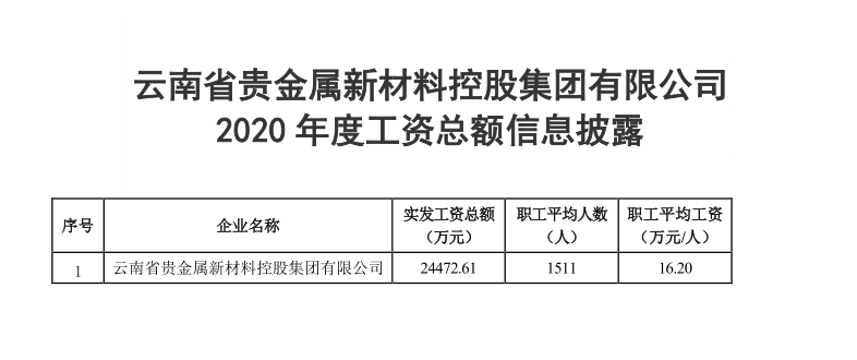 云南省贵金属金年会招牌至上有限公司2020年度工资总额信息披露